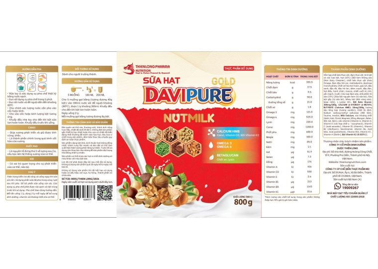 Thành phần: Hỗn hợp bột các loại hạt (hạt điều, hạt óc chó, hạt hạnh nhân, diêm mạch, mè đen, mè trắng, hạt sen, kê nếp, hạt chia, yến mạch, gạo lứt, huyết rồng, lúa mì, đại mạch, bắp, đậu đen, đậu xanh, đậu đỏ, đậu ngự, đậu hà lan, đậu gà, đậu trắng, hạt lanh), đạm đậu thuỷ phân, chất xơ (Inulin/Fos), Omega 6, Omega 3, Lysine, Beta-Hydroxy Methylbutyrate (HMB), L-Carnitine, Choline, Docosahexaenoic acid (DHA), Axit Eicosapentaenoic (EPA), Taurine, Lactoferrin, hỗn hợp vitamin (Retinyl acetat (Vitamin A), Cholecalciferol (Vitamin D3), DL-anpha-Tocopherol (Vitamin E), Thiamin hydrocloride (Vitamin B1), Riboflavin (vitamin B2), Nicotinamide (Vitamin B3), D-pantothenic acid (Vitamin B5), Pyridoxin hydrocloride (Vitamin B6), Acid folic (Vitamin B9), Phylloquinon (Vitamin K1), Menaquinon (Vitamin K2), D-biotin (biotin), Acid L-ascorbic (Vitamin C)) và khoáng chất (Tribasic calcium phosphate, Kali glycerophosphat, Natri sulfat, Magnesi oxyd, Kẽm sulfat, Sắt (III) pyrophosphate, Natri iodid, Mangan sulfat), chất tạo ngọt tổng hợp (Isomalt), hương liệu tổng hợp (hương ngũ cốc).